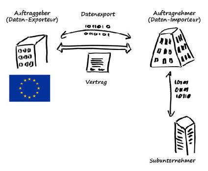 Beispiel Subunternehmer CRM-Betreiber: Ein Unternehmen mit Sitz in den USA (Importeur) bietet ein CRM-System an, das Kunden aus Deutschland (Exporteur) über das Internet nutzen. Der US-Anbieter schaltet beim Betrieb des Systems seinerseits Drittfirmen ein, zum Beispiel Wartungsfirmen, die defekte Festplatten in Servern austauschen, Datenbanken administrieren oder Speicherplatz und Rechenkapazität zur Verfügung stellen. All diese Lieferanten sind Unterauftragsdatenverarbeiter (sub-processor) des Importeurs, die von den alten Standardvertragsklausen nicht gedeckt waren.