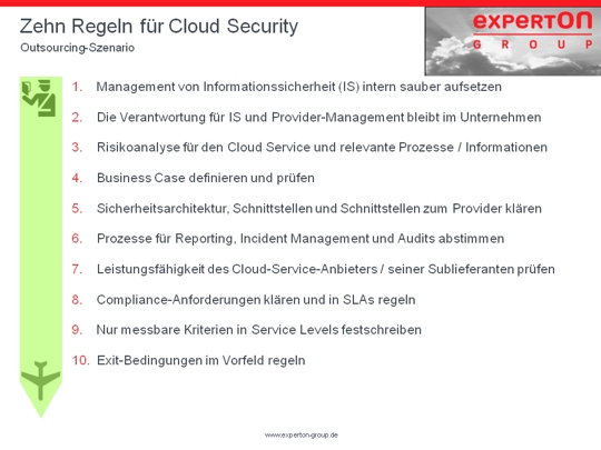 - 10. Der Kunde muss im Vorfeld festlegen, wie die Exit-Bedingungen im Falle eines Providerwechsels aussehen. Ein "Vendor-Lock-In" kann das Unternehmen im Ernstfall teuer zu stehen kommen.
