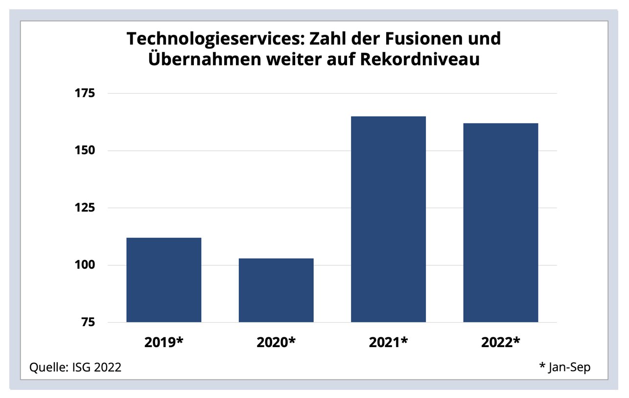 Die Zahl der Unternehmensfusionen und -übernahmen unter Technologiedienstleistern blieb 2022 bisher unverändert hoch, Bild: ISG