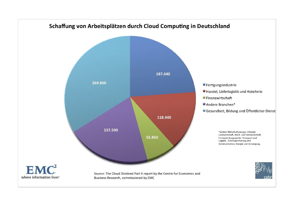 Jenseits von monetären Effekten schafft Cloud Computing europaweit vor allem auch neue Jobs. In Summe werden 2,4 Millionen bis 2015 prognostiziert. Allein für das Bildungs- und Gesundheitswesen sowie den öffentlichen Dienst erwartet der Cebr-Report in den genannten Ländern mehr als 800.000 zusätzliche Arbeitsplätze. Im Einzelnen verteilen sich die kumulativen Cloud-Effekte von 2010 bis 2015 wie folgt auf verschiedene Wirtschaftszweige: