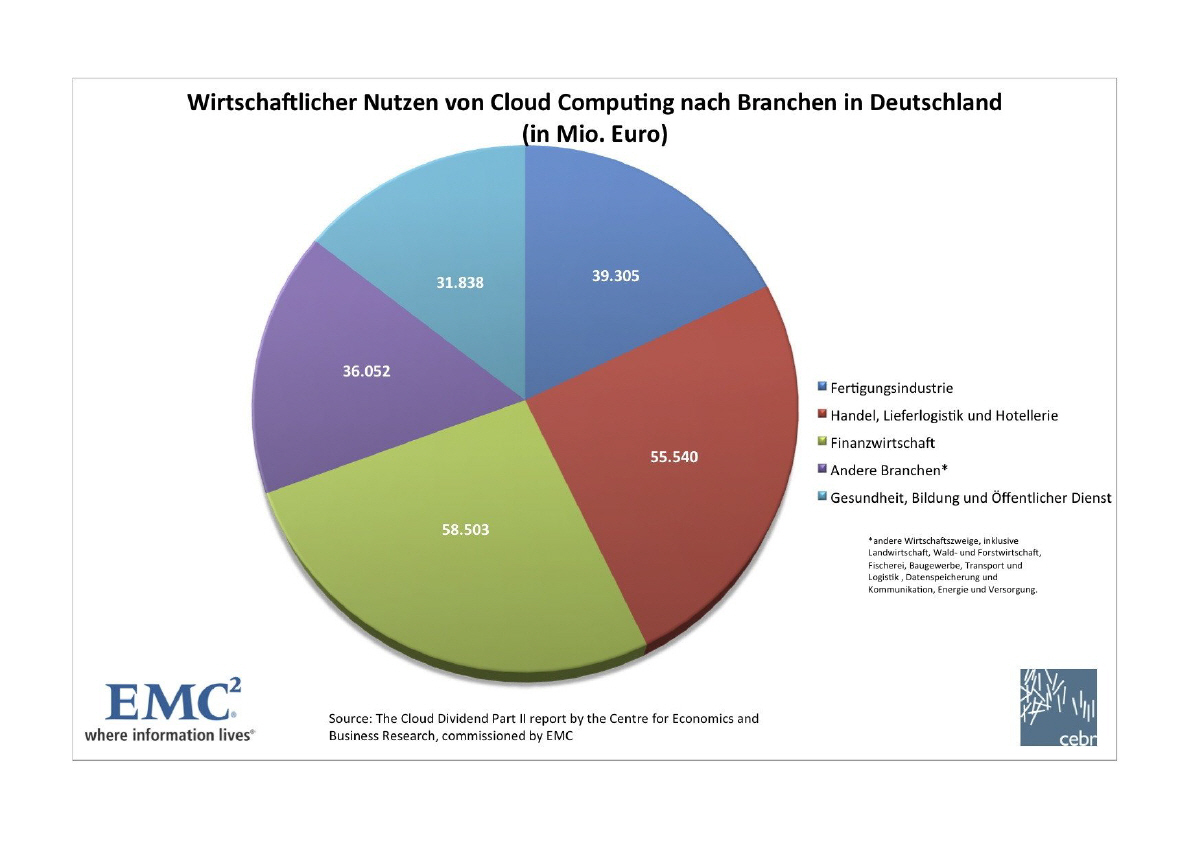 Er beleuchtet den Einfluss von Cloud Computing auf verschiedene Wirtschaftszweige. Mit zusammen 233 Milliarden Euro profitieren Handel, Lieferlogistik und Hotellerie bis 2015 am meisten vom Cloud Computing-IT-Modell in den fünf genannten Ländern. Dieser Effekt wird zu 77 Prozent durch Private und Hybrid Clouds erzielt. In Deutschland ist es jedoch die Finanzwirtschaft, die mit 58,5 Milliarden Euro am stärksten durch die ökonomischen Cloud-Vorteile gewinnt. Handel, Logistik und Hotellerie profitieren hierzulande mit 55,5 Milliarden Euro und die deutsche Fertigungsindustrie mit 39,3 Milliarden Euro von Cloud Computing.