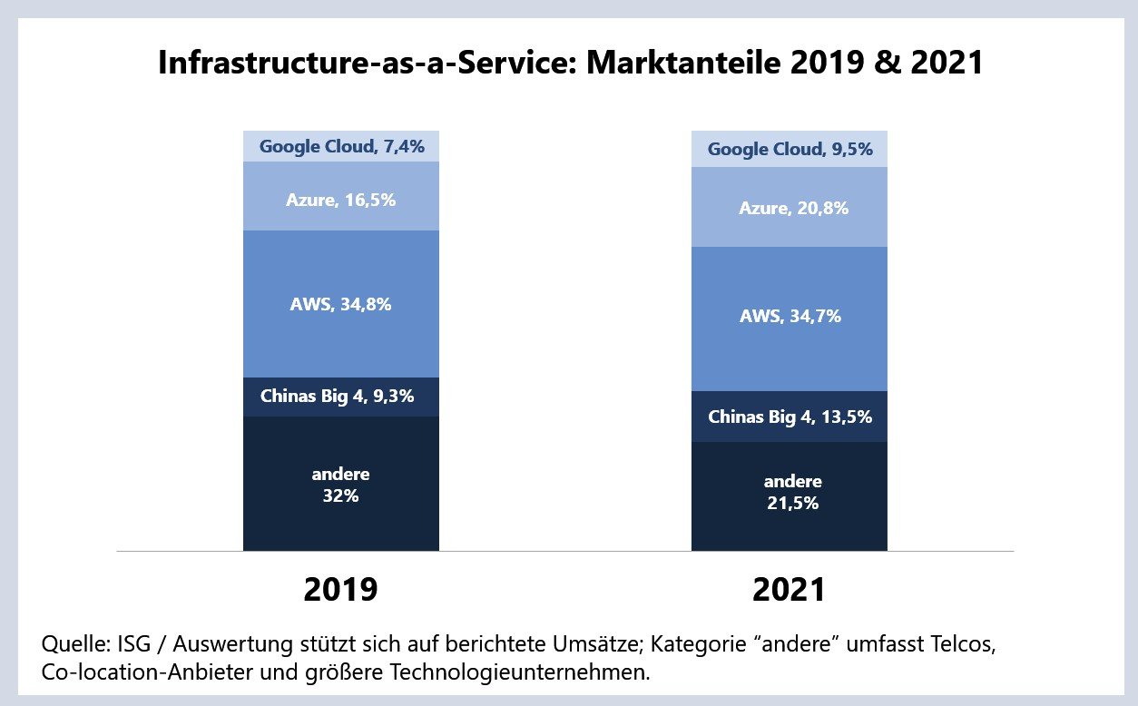 Das Marktforschungs- und Beratungsunternehmen Information Services Group (ISG) stützt diese Auswertung auf die Umsatzzahlen, die die weltweit führenden IaaS-Anbieterin in ihren Geschäftsberichten für 2019 und 2021ausgewiesen haben.