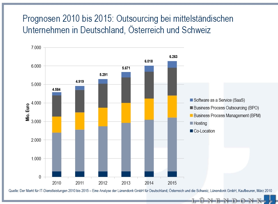 Nach allgemeinem Verständnis setzen sich Outsourcing-Dienstleistungen aus Co-Location (Unterbringung und Netzanbindung eines eigenen Servers im Rechenzentrum des Dienstleisters), Hosting, Business Process Management (BPM) / Business Process Outsourcing (BPO) sowie Software-as-a-Service (SaaS) zusammen. Für 2010 wird für besagte Dienste ein Marktvolumen von 22 Milliarden Euro prognostiziert. Bis 2015 soll dieser Wert auf etwa 29 Milliarden Euro ansteigen, was einem durchschnittlichen jährlichen Wachstum von sechs Prozent entspricht.
