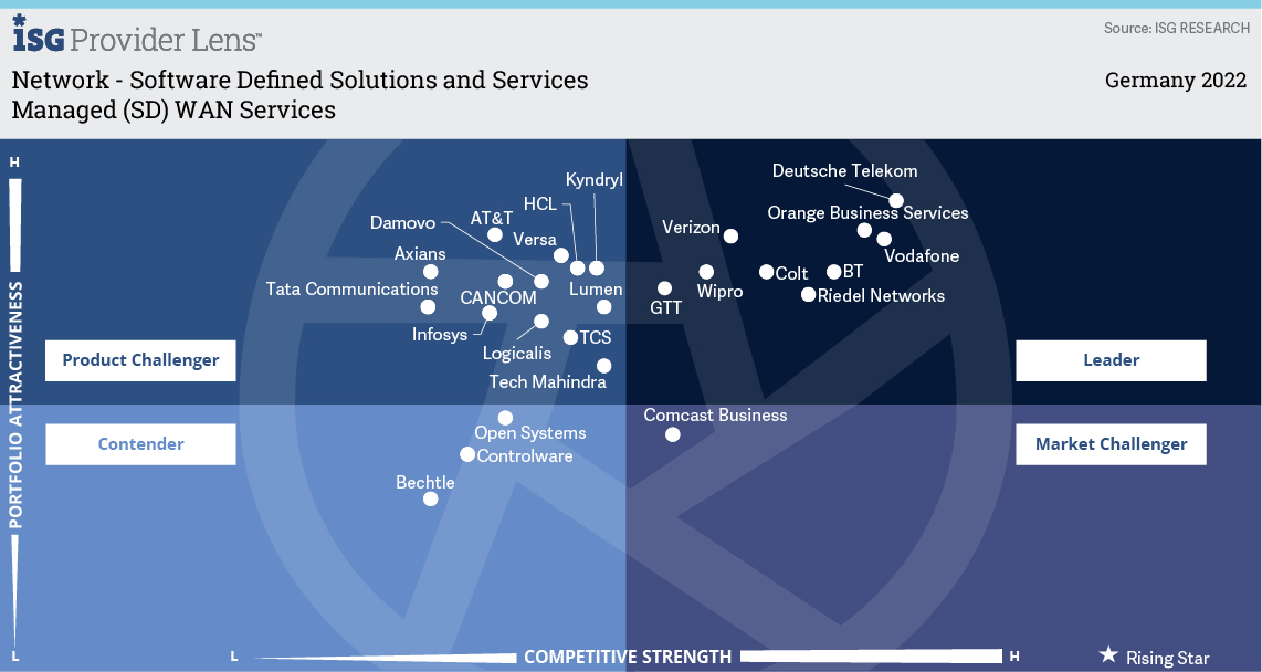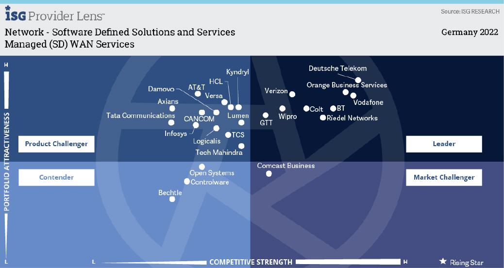 Die Studie stuft Deutsche Telekom in allen fünf Marktsegmenten als "Leader" ein. Orange Business Services und Vodafone erhalten diese Einstufung in vier Marktsegmenten sowie Computacenter, Extreme Networks und Wipro in jeweils drei Segmenten. BT, Colt, NTT und Verizon sind "Leader” in je zwei Segmenten, während Apcela, Axians, CANCOM, Cisco, Damovo, GTT, IBM, Juniper Networks, Logicalis und Riedel Networks diese Einstufung in je einem erhalten.