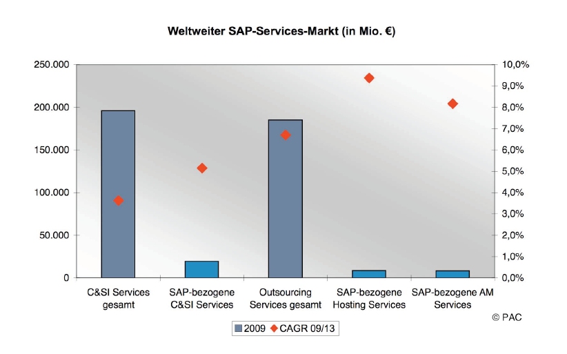 Nichtsdestotrotz leidet der Markt für SAP-Projektgeschäft unter der Wirtschaftskrise. So erwartet PAC lediglich für die Region APAC (Asia Pacific) in diesem Jahr mit +1,5 Prozent noch ein leichtes Wachstum bei SAP-bezogenen C&SI Services, während die Region "Americas" mit einem Rückgang um mehr als 4 Prozent am meisten betroffen ist, und EMEA (Europe, Middle East & Africa) mit einem leichten Rückgang um 2,5 Prozent noch besser dasteht. Bei all diesen negativen Wachstumsraten darf man aber auch nicht vergessen, dass nicht nur Projektvolumen aus dem Markt genommen wird, sondern auch Preisreduzierungen damit einhergehen.