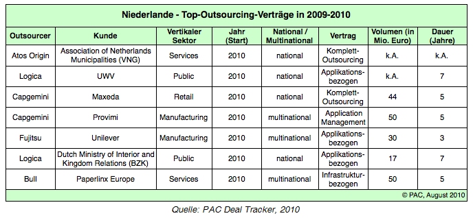 Der Outsourcing-Markt ist der einzige Bereich des SITS (Software & IT Services)-Marktes in den Niederlanden, der 2009 Wachstum aufwies. PAC verzeichnete in 2009 einen Anstieg von 0,4 Prozent in diesem Segment und erwartet für 2010 eine Beschleunigung bis auf 2,2 Prozent Wachstum. Im Outsourcing-Bereich wird das Outsourcing im Bezug auf Applikationen im Brennpunkt stehen, da die Unternehmen versuchen, die betriebliche Effizienz zu erhöhen, indem sie sich der Last des internen System-Managements durch Auslagerung entledigen.