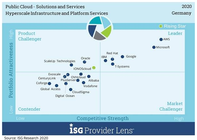 Im Teilmarkt der "Hyperscale Infrastructure & Platform Services" untersuchte ISG insgesamt 19 Anbieter, wovon sich sechs als "Leader" positionieren konnten und einer als "Rising Star". Dies ist nach ISG-Definition ein Unternehmen mit "vielversprechendem Portfolio" und "hohem Zukunftspotenzial".