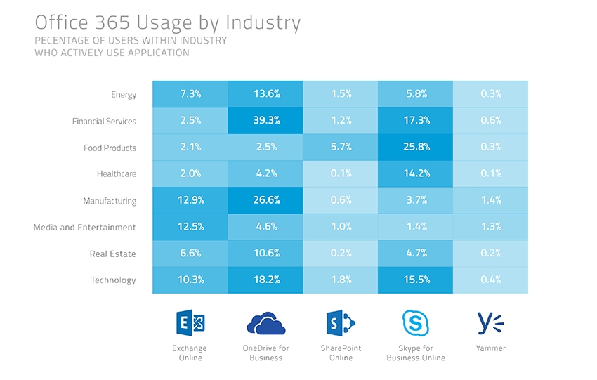 Bei den Finanzdienstleistern arbeiten 39 Prozent der Angestellten mit OneDrive for Business und 17 Prozent mit Skype for Business. Im Healthcare-Bereich ist Skype for Business die beliebteste Office-365-Anwendung - rund 14 Prozent der Angestellten nutzen sie für ihre Kommunikation. Bei produzierenden Unternehmen führt mit 13 Prozent der Anwender Exchange Online das Feld an, gefolgt von Medien- und Unterhaltungsfirmen, die 12,5 Prozent aktive Exchange-Nutzer aufweisen. (Skyhigh Networks: ra)
