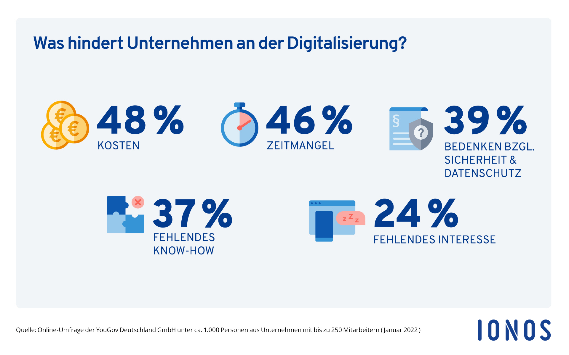 Die verwendeten Daten beruhen auf einer Online-Umfrage der YouGov Deutschland GmbH im Auftrag von Ionos unter 1.004 Personen aus kleinen und mittelständischen Unternehmen mit bis zu 250 Mitarbeitern in Deutschland (Befragungszeitraum 14.-24.01.2022).