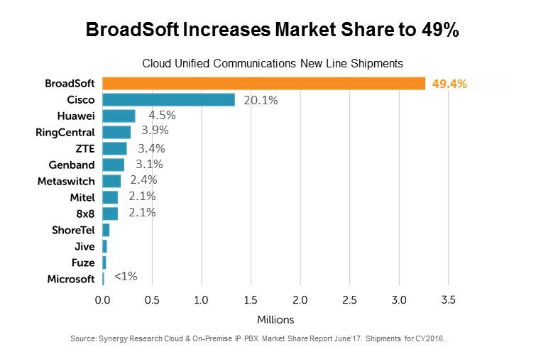 Als einen Grund für den Ausbau der Führungsposition sieht das Unternehmen die Einführung von BroadSoft Business, einem vollständig integrierten Portfolio um Unternehmens-Lösungen für Cloud Unified Communications, Team Collaboration und Contact Center. BroadSoft Business kann auf alle Marktsegmente skaliert werden und umfasst drei Kernanwendungen: UC-One, Team-One und CC-One. Innerhalb dieser ermöglicht der ebenfalls 2016 gelaunchte BroadSoft Hub Usern, mithilfe künstlicher Intelligenz gebündelt auf Informationen und Anwendungen zugreifen zu können.