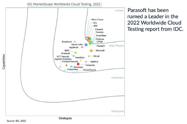 Parasoft, Anbieterin von automatisierten Softwaretests, wird von IDC MarketScape in seinem "Worldwide Cloud Testing 2022 Vendor Assessment - Empowering Business Velocity" (Doc # US47097221) als Leader klassifiziert. In diesem Report evaluierte IDC 24 Anbieter von SaaS für Cloud Testing und automatisierte Softwarequalität (ASQ). Die Auswahl der Anbieter basiert auf den ASQ-Cloud-Fähigkeiten und -Strategie ihrer Produkte, dem Umsatzanteil sowie der Alleinstellung und den Kapazitäten in diesem aufstrebenden Markt. Parasoft wurde für sein technologisches Fundament im Bereich Testen, seine weitreichenden Fähigkeiten im ASQ-Bereich und seinen vorbildlichen Kundensupport ausgezeichnet.