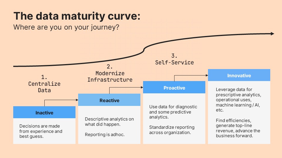 Auf die zweite Stufe gelangen Unternehmen, indem sie Daten aus verschiedenen Quellen verbinden können. Das gibt Ihnen die Möglichkeit, deskriptive Analysen und Ad-hoc-Reports zu erstellen. Das Problem: Jüngere Unternehmen erhalten oft unvollständige Analysen, etablierte haben mit einer Legacy- oder DIY-Infrastruktur zu kämpfen. "Hier scheitern zahlreiche Unternehmen", so die Erfahrung von Mark Van De Wiel. Denn die Zentralisierung von Daten ist eine komplexe Aufgabe: Der Aufbau und die Pflege von Datenpipelines sind zeit- und ressourcen-intensiv, die Pipelines meist von Unterbrechungen gekennzeichnet. Das führt zu langsamen Prozessen und einer mangelhaften Datenqualität, die sich nicht als Basis für vertrauenswürdige KI-Anwendungen eignet.