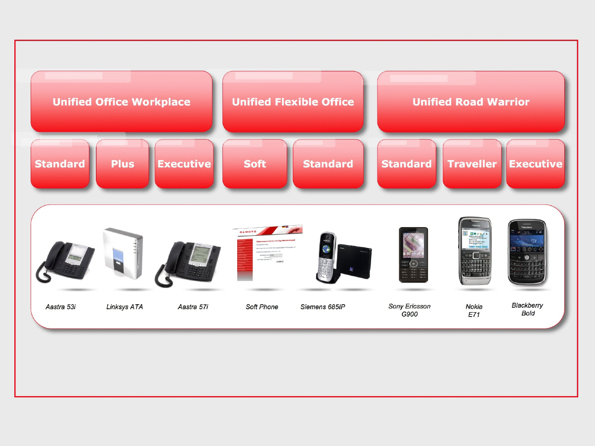 UC as a Service von Damovo besteht aus den modularen Paketen Unified Office Workplace (für Mitarbeiter mit festem Arbeitsplatz im Büro), Unified Flexible Office (für Mitarbeiter, die sich mit ihrem schnurlosen Telefon innerhalb des Firmengeländes aufhalten können) und Unified Road Warrior (für Außendienstmitarbeiter mit Handys). Neben einer Reihe marktgängiger Smartphones wird Damovo ab dem zweiten Quartal 2009 auch Apples iPhone unterstützen. Unternehmen können die einzelnen modularen Pakete je nach ihren Anforderungen pro Arbeitsplatz nutzen. Die Vertragsmindestlaufzeit für UC as a Service beträgt sechs Monate, die Kündigungsfrist einen Monat.